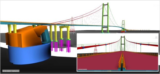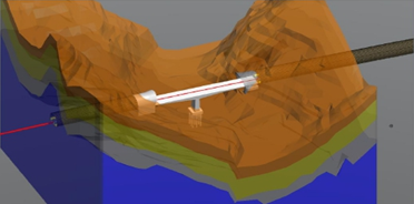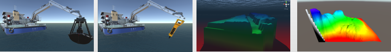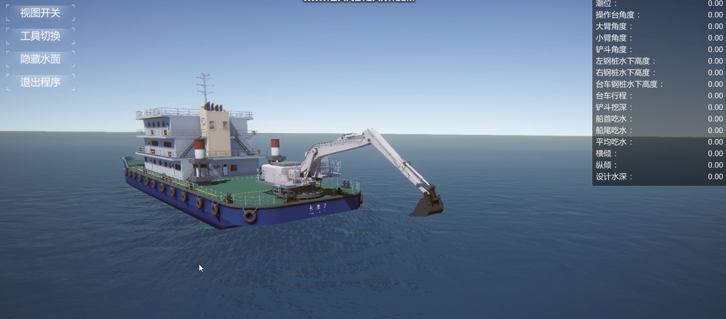 系统采用数字孪生技术对工程船进行三维虚拟仿真,实现对远程现场作业船工作状态的三维实时动态展示。船体部分通过采集PLC的数据进行潮位、旋转角度、机械设备角度、钢桩高度、台车高度、台车行程、挖深、吃水、纵横倾、坐标等内容进行还原。地形部分通过采集多波束雷达返回的实时数据为基础,进行具有多级精度全地形三维动态仿真。
