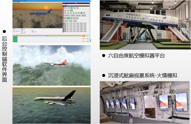 产品将飞行数据还原至软件系统内,配合6自由度运动平台,模拟飞机从滑行,起飞,自主巡航到降落各阶段真实飞行姿态,以用于受培训人员,根据飞行手册处理相应规程、故障或特情(如起火等),并进行训练效果评判的一种智能系统。