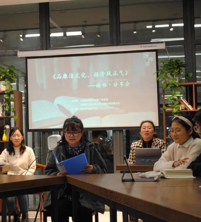 活动分为“读书思廉”和“阅读分享”两个部分。吴书记首先围绕学廉、思廉、崇廉、守廉等内容进行了发言,畅谈读好书、读廉洁主题书刊的所感所悟,向同学们推荐了传统经典的《道德经》,《夜航船》、《山海经》、《红楼梦》等书。他说:“通过读廉书、思廉政、说廉语,希望同学们进一步坚定理想信念,打牢廉洁自律的思想基础,筑牢抵御腐败的防线。”