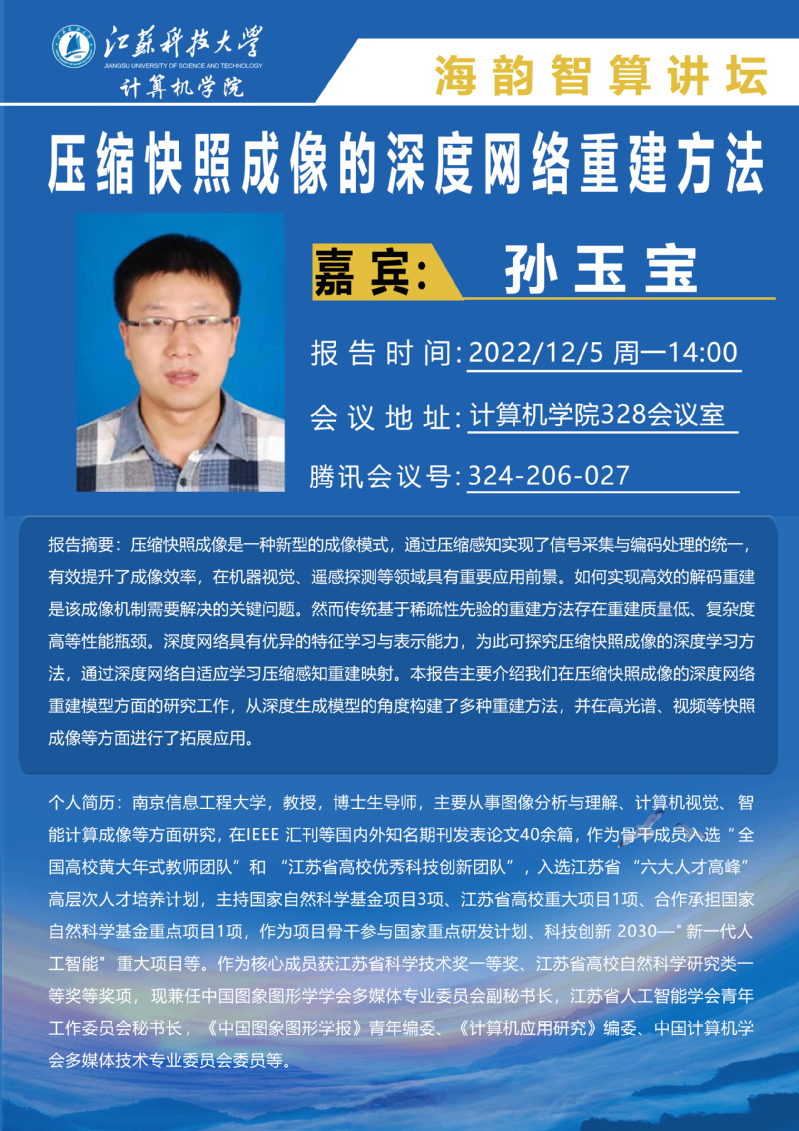 海韵智算讲坛:(孙玉宝)压缩快照成像的深度网络重建方法