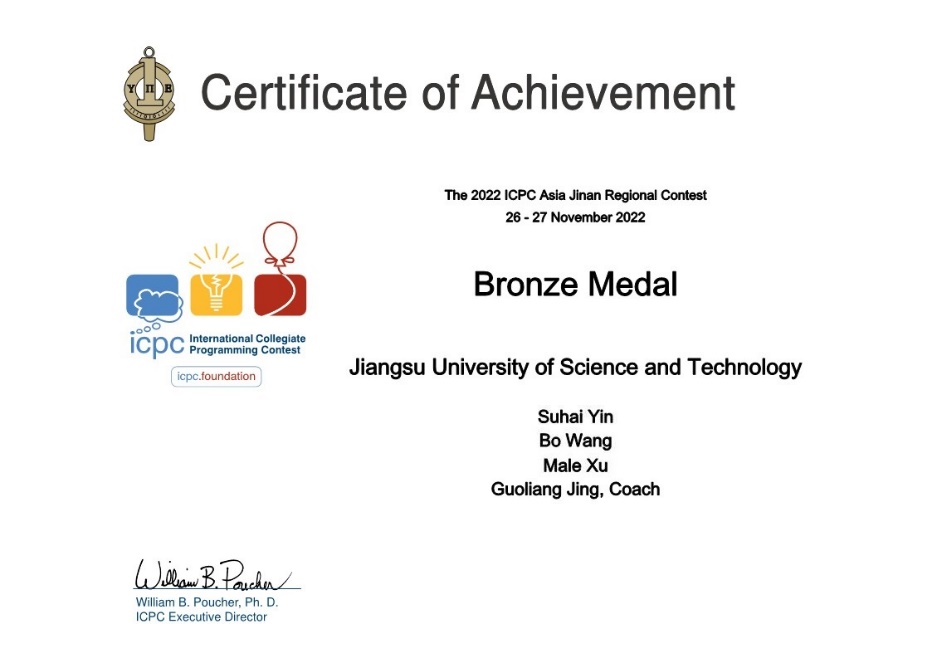 近日,第47届ICPC国际大学生程序设计竞赛亚洲区域赛在齐鲁工业大学举行,来自亚洲地区299所知名高校的580支队伍参加了竞赛。江苏科技大学在9月中旬举行的预赛中从3600多支队伍中脱颖而出,进入亚洲区域赛,经过两天智力与体力的算法编程激战,由计算机学院殷苏海、王博、续马乐三位同学组成团队在教练景国良老师带领下夺得铜奖。