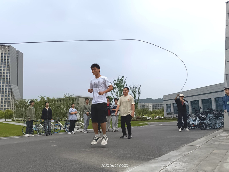 图书馆辅楼处,同学们手持细绳,齐心协力跳起了欢快的大绳舞,场面欢声笑语。