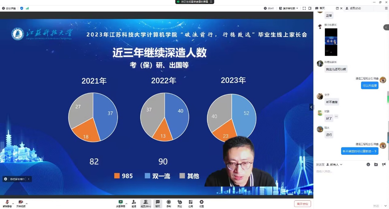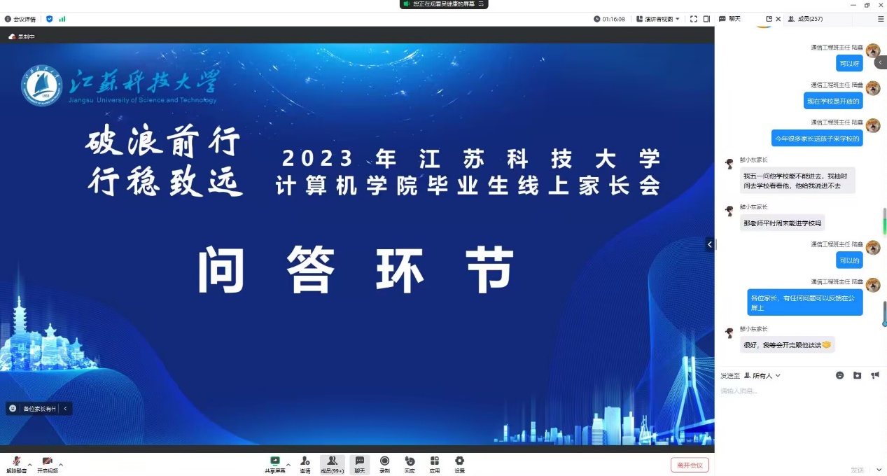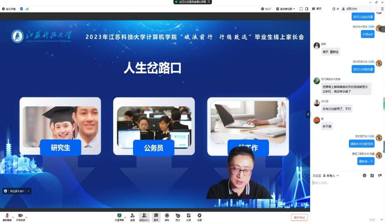 为了进一步加强家校联动,贯彻我校2024届毕业生就业工作指示精神,精准助力2024届学生高质量就业。9月20日,计算机学院在线上举办“破浪前行,行稳致远”2024届毕业生家长会。2020级全体学生家长及各专业班主任,共280余人参加会议。会议由党委副书记吴健康主持。