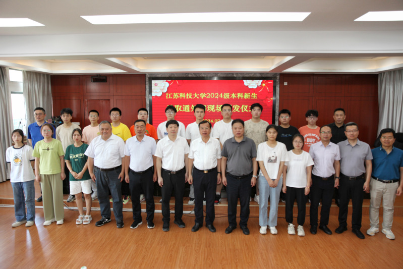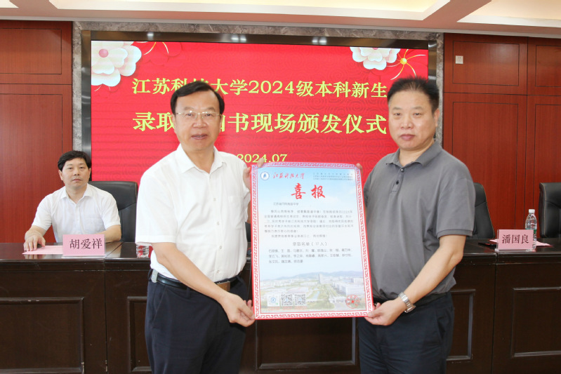 江苏科技大学党委书记周南平向江苏省丹阳高级中学党委书记、校长潘国良赠送喜报,并为17位新生颁发录取通知书。