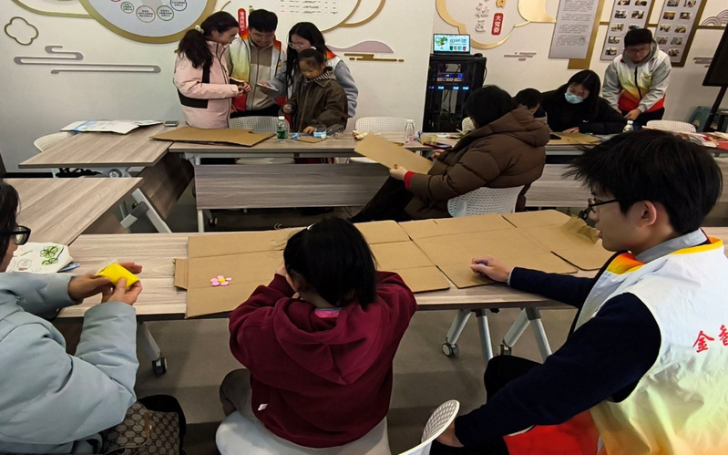 在知识普及环节之后,实践团成员携手社区老中幼居民,共同开展了“变废为宝 - 长江江豚”主题手工实践活动。活动现场,平日里堆放在角落的废弃纸箱、粘土等材料,在大家的巧手下被赋予了新的生命。大人和小孩们热情高涨,创意不断。有的小朋友用粘土精心捏制出可爱的江豚,并模拟出逼真的海洋环境;有的居民则充分发挥自己的创意,拿起废弃的快递纸箱,用彩铅绘出栩栩如生的江豚形象,再巧妙地裁剪下来。活动过程中,大人与小孩积极互动,温馨和谐的氛围洋溢在整个会议室,大家共同体验着循环利用废弃物带来的乐趣与成就感。
