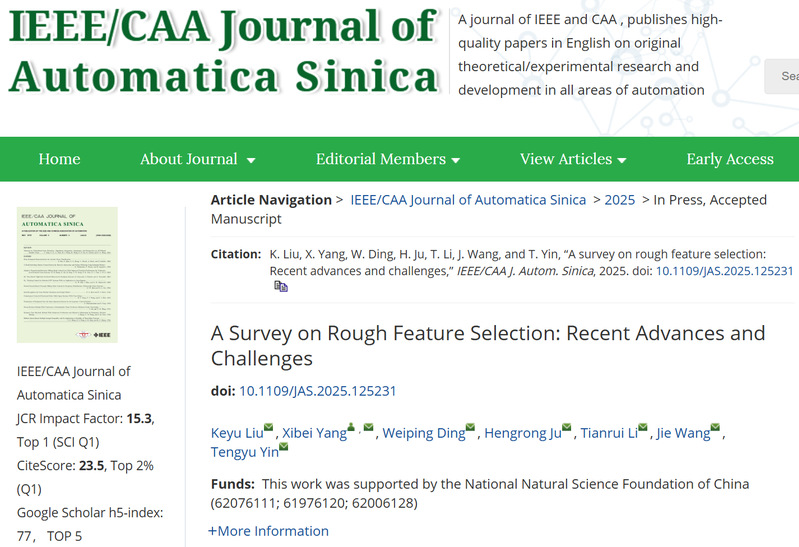 近日,我校计算机学院刘克宇老师作为第一作者撰写的论文《A survey on rough feature selection: Recent advances and challenges》在国际计算机科学领域顶级期刊《IEEE/CAA Journal of Automatica Sinica》上发表,江苏科技大学为第一署名单位,计算机学院杨习贝教授为唯一通信作者。这是我校计算机学院首次在《IEEE/CAA Journal of Automatica Sinica》上发表科研论文。