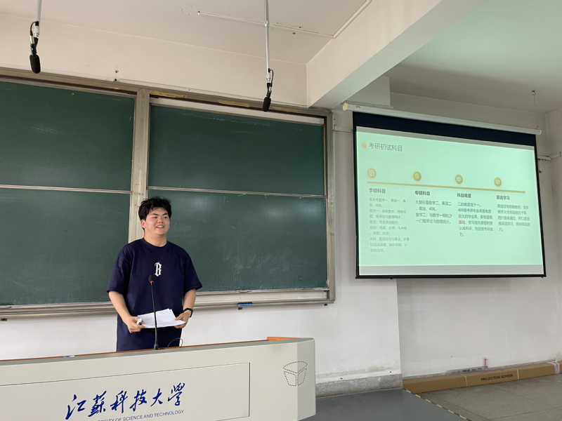 活动邀请了两位2021级计算机科学与技术专业的优秀学子进行经验分享。韩炜同学以优异成绩考入河海大学,他围绕“全面了解考研及建议”主题,详细介绍了考研的基本信息、初试与复试的备考策略,并强调了大一大二阶段打好基础的重要性。他建议同学们注重通识课程和专业课程的学习,积极参与学科竞赛,提升综合素质。雷梓翊同学则分享了考入西安电子科技大学的经历,重点讲解了择校方法、复习规划及时间管理技巧。他特别提醒同学们要根据自身情况制定合理的学习计划,并坚持到底。